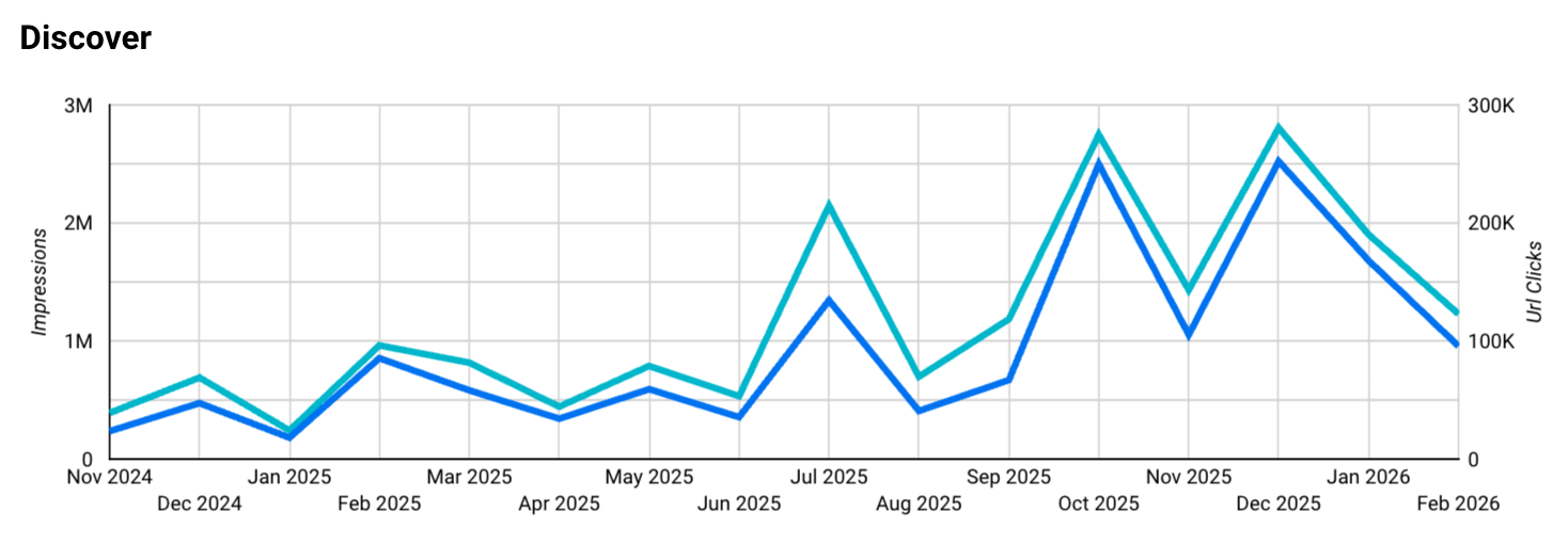 This is what topical authority looks like in data. Each article that gets entity markup adds to Google’s understanding of what the site covers and how deeply it covers it. Early on, Google needs a standout article to justify surfacing the site in Discover. Over time, it develops enough confidence in the publisher’s topical coverage to recommend multiple articles at once.